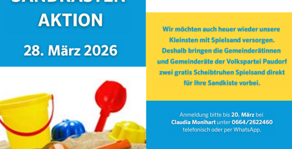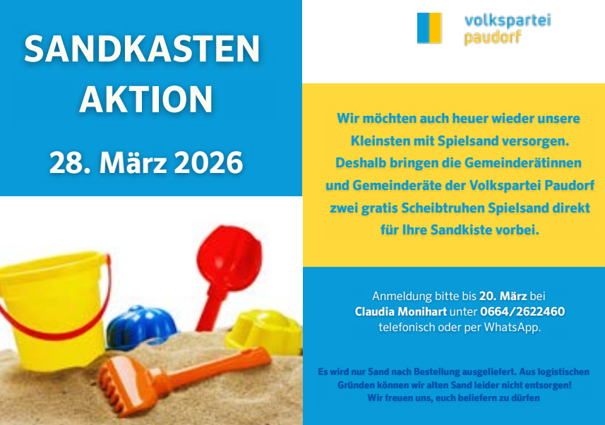 Wir möchten auch heuer wieder unsere Kleinsten mit Spielsand versorgen. Deshalb bringen die Gemeinderätinnen und Gemeinderäte der Volkspartei Paudorf zwei gratis Scheibtruhen Spielsand direkt für Ihre Sandkiste vorbei.