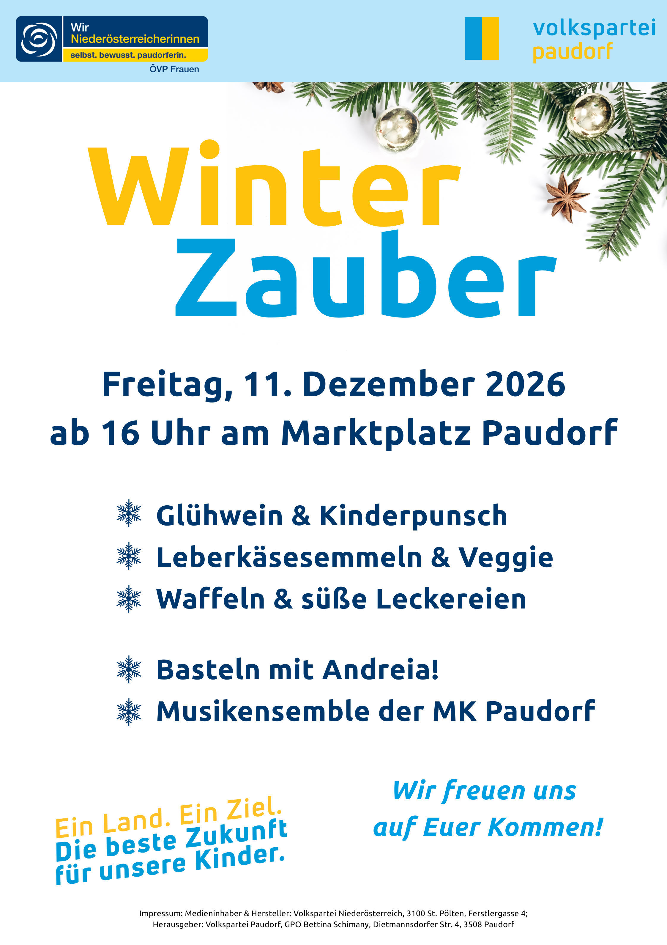Am Freitag, 11. Dezember 2026, ab 16 Uhr lädt der Marktplatz Paudorf zum gemütlichen Winterzauber ein.